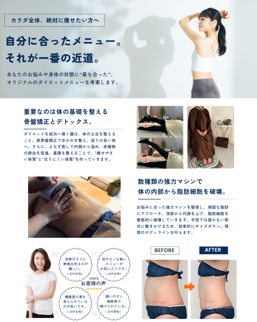 リラクゼーション、フェイシャルエステ、痩身、体質改善、etc..